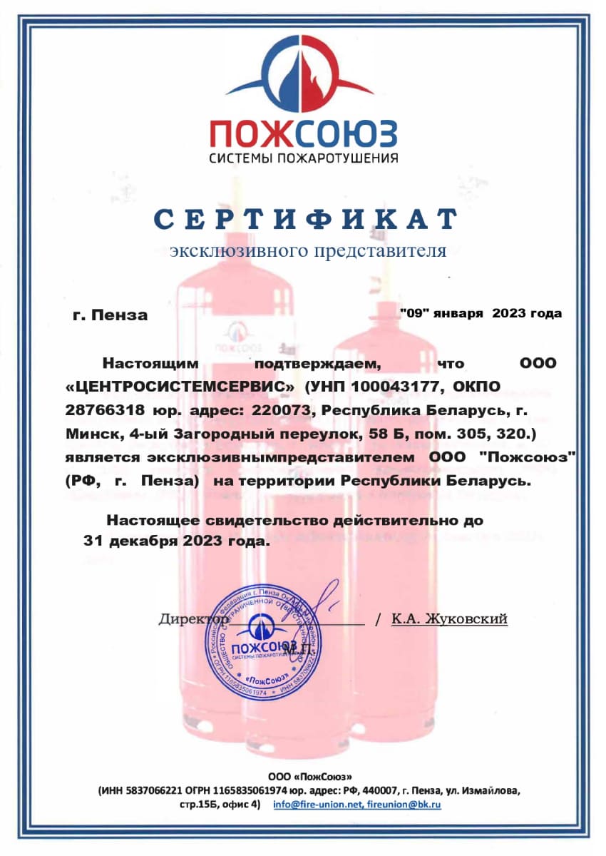 ООО «ЦЕНТРОСИСТЕМСЕРВИС» является представителем организации-изготовителя модулей газового пожаротушения (МГП) ООО «ПожСоюз» (РФ).